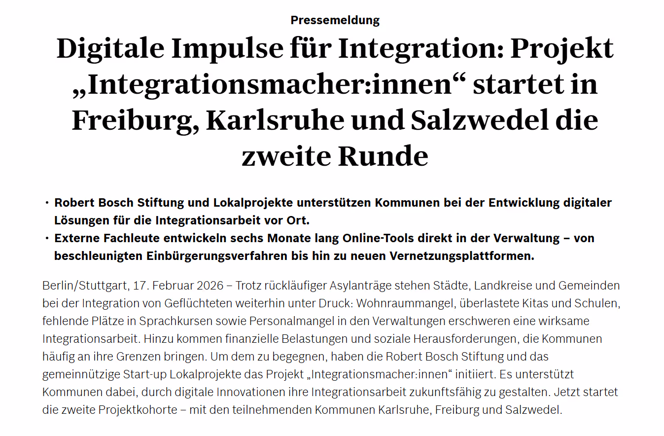 Lokalprojekte bringt engagierte Menschen aus Verwaltung und Gesellschaft zusammen, um langfristige Lösungen für lokale Herausforderungen zu schaffen. Gemeinsam setzen wir Projekte um, die Zukunft gestalten: von der digitalen Transformation, über lokalen Klimaschutz, bis hin zur Integrationsarbeit.